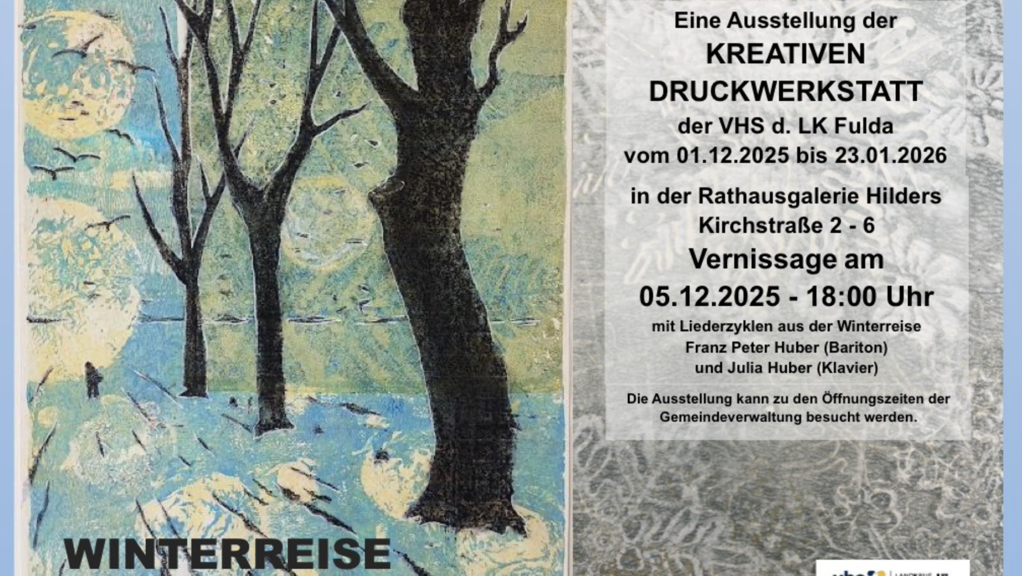 Die Ausstellung „Winterreise“ der Kreativen Druckwerkstatt Fulda lädt dazu ein, die kalte Jahreszeit aus künstlerischer Perspektive zu entdecken. In der Rathausgalerie Hilders präsentieren die Kursteilnehmerinnen und Kursteilnehmer eine eindrucksvolle Vielfalt handgefertigter Druckgrafiken, entstanden in unterschiedlichen künstlerischen Drucktechniken.