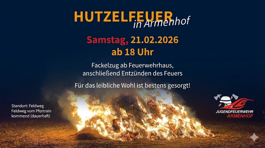 Am Samstag, den 21.02.2026, wird es in Armenhof wieder richtig gemütlich und feurig. Ab 18:00 Uhr lädt das traditionelle Hutzelfeuer Jung und Alt zu einem stimmungsvollen Abend unter freiem Himmel ein.