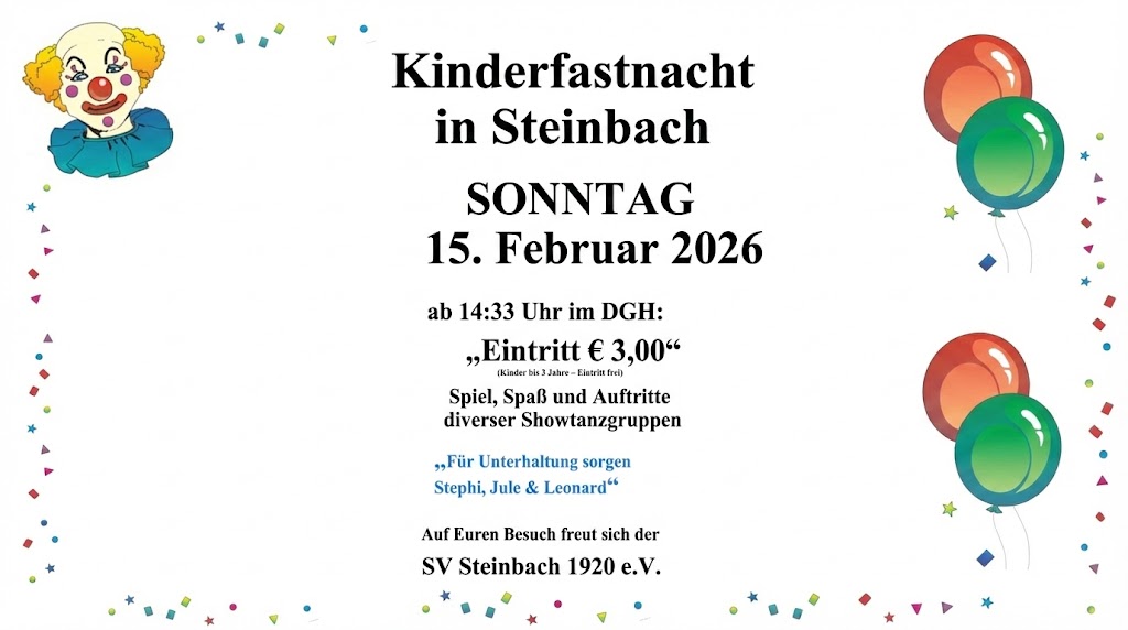 Am Sonntag, 15. Februar 2026, heißt es in Steinbach wieder: Bühne frei für kleine Narren 🥳🎈