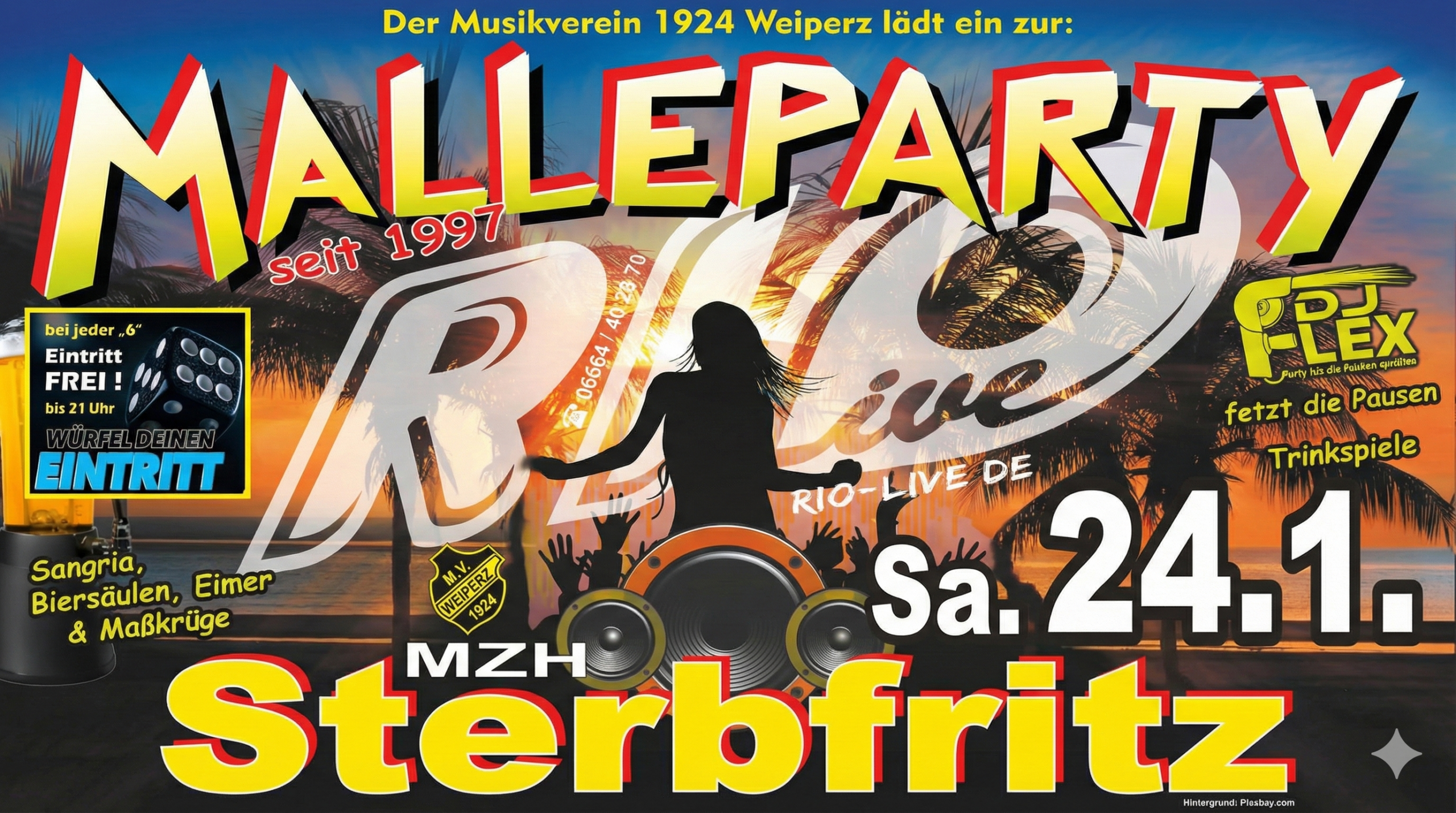 Seit 1997 ist es Tradition und auch 2026 heißt es wieder Bühne frei für die legendäre Malleparty in der Mehrzweckhalle Sterbfritz. Am Samstag, den 24.01.2026, verwandelt sich Sinntal-Sterbfritz erneut in eine echte Ballermann Hochburg und lädt zum Feiern, Tanzen und Eskalieren ein.