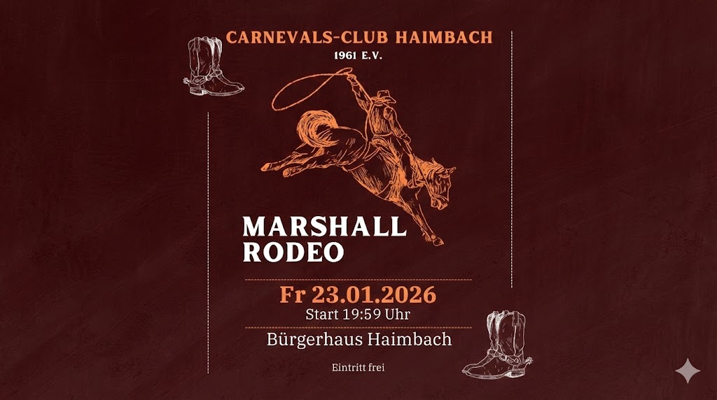 Ab 19:59 Uhr lädt der Carnavals-Club Haimbach 1961 e.V. zum Marshall Rodeo ein – einem stimmungsvollen Fastnachtsabend mit starken Auftritten, guter Laune und echtem Gemeinschaftsgefühl 🤠🎶