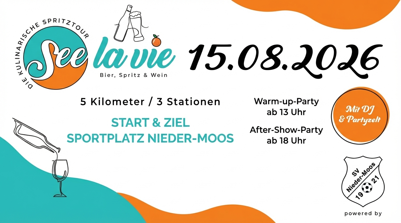 Der SV Nieder-Moos 1921 lädt euch zu einem ganz besonderen Erlebnis ein: einer kulinarischen Wanderung rund um den malerischen Nieder-Mooser See! Hier verschmelzen Genuss und Natur zu einem unvergesslichen Tag voller Geschmackserlebnisse. Auf einem entspannten 5-Kilometer-Rundweg erwarten euch drei liebevoll gestaltete Genuss-Stationen, an denen ihr euch mit erlesenen Weinen, frisch gezapftem Bier und erfrischenden Spritz-Variationen verwöhnen lassen könnt. Dazu gibt es passende Snacks, die perfekt auf die Getränke abgestimmt sind. Ein Event, das Wanderfreunde und Genießer gleichermaßen begeistern wird!