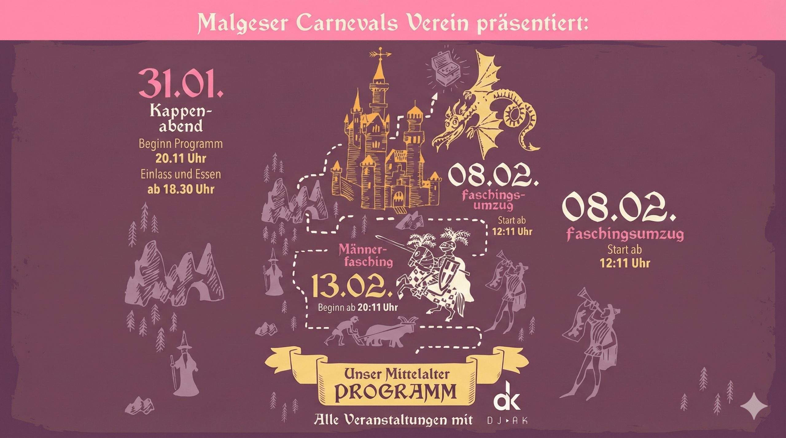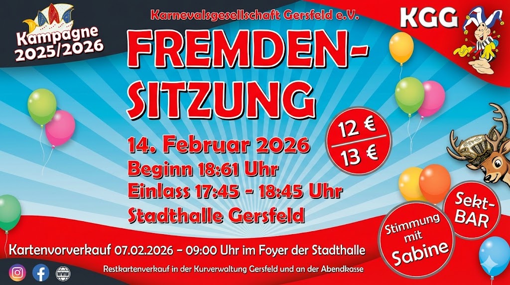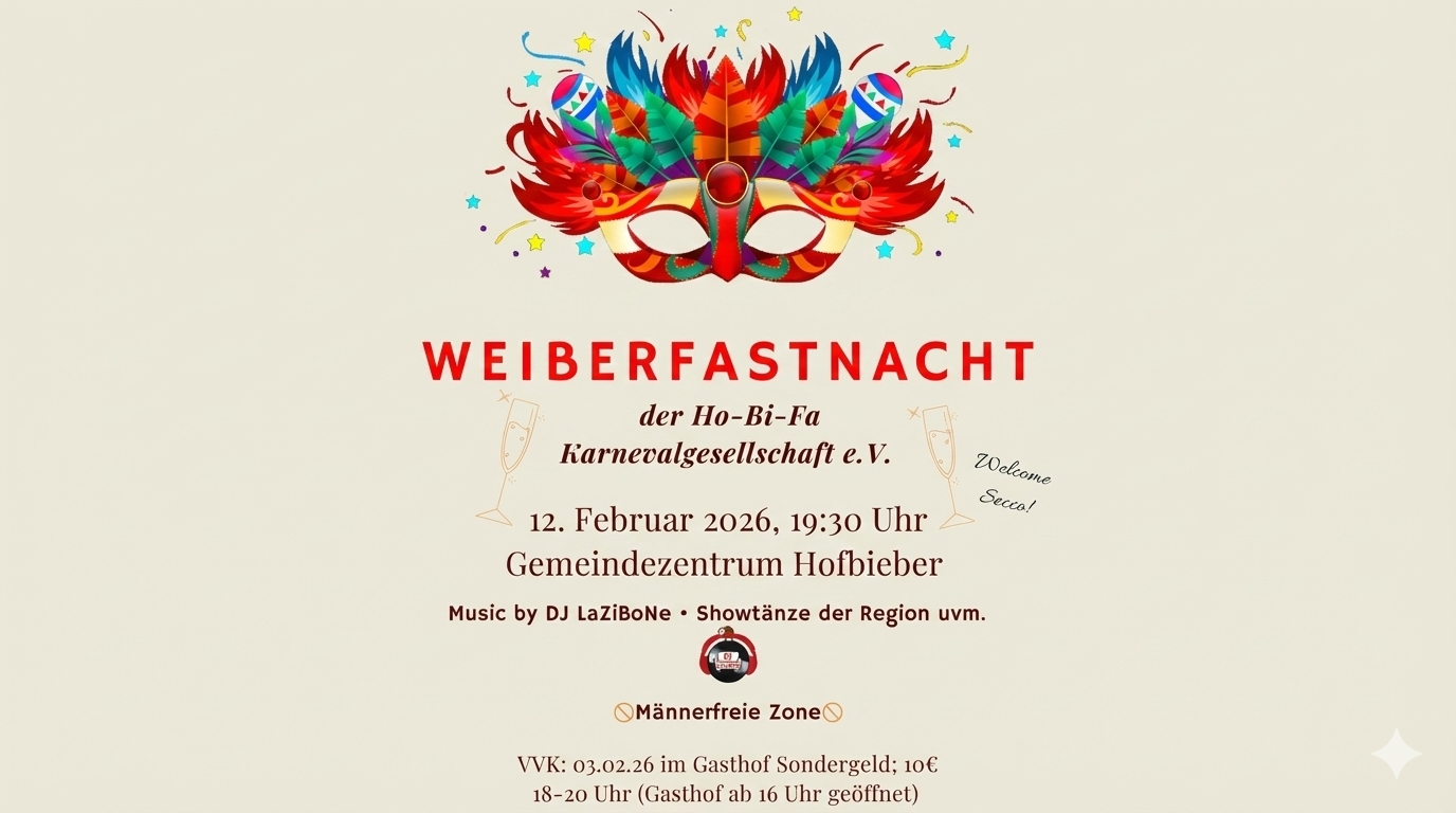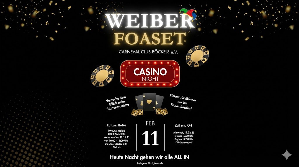 ππ° WEIBERFOASET β Casino Night π°π Am Mittwoch, den 11.02.2026, heiΓt es im DGH Almendorf: Karten auf den Tisch, Drinks in die Hand und rein ins nΓ€rrische Spiel β£οΈβ¨ Die Weiberfoaset steht dieses Jahr ganz im Zeichen der Casino Night und verspricht einen Abend voller Foaset, SpaΓ und guter Laune. Freut euch auf eine ausgelassene […]