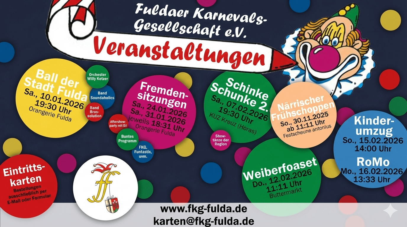 🎈🎭 Kinderumzug Fulda 2026 🎭🎈 Fastnachtsspaß fΓΌr die kleinen Narren Am Sonntag, den 15.02.2026, gehΓΆrt Fulda ganz den Kindern. Einen Tag vor dem grâßten Rosenmontagsumzug Hessens findet traditionell der Kinderumzug statt und bringt bunte KostΓΌme, frΓΆhliche Gesichter und jede Menge gute Laune in die Innenstadt. πŸ₯³πŸ¬ Ab 14:00 Uhr ziehen die kleinen NΓ€rrinnen und Narren […]
