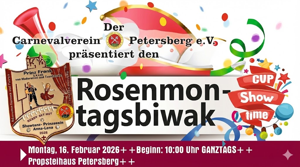 πŸŽ­πŸŽ‰ Rosenmontagsbiwak des Carnevalverein Petersberg e.V. πŸŽ‰πŸŽ­ Bevor es am Rosenmontag zum großen Umzug nach Fulda geht, wird in Petersberg noch einmal richtig aufgedreht. Der Carnevalverein Petersberg e.V. lΓ€dt herzlich zum traditionellen Rosenmontagsbiwak ein – der letzte große Treffpunkt, bevor sich alles Richtung Fulda bewegt πŸ₯³πŸŽΊ Am Montag, den 16. Februar 2026, marschiert der CVP […]