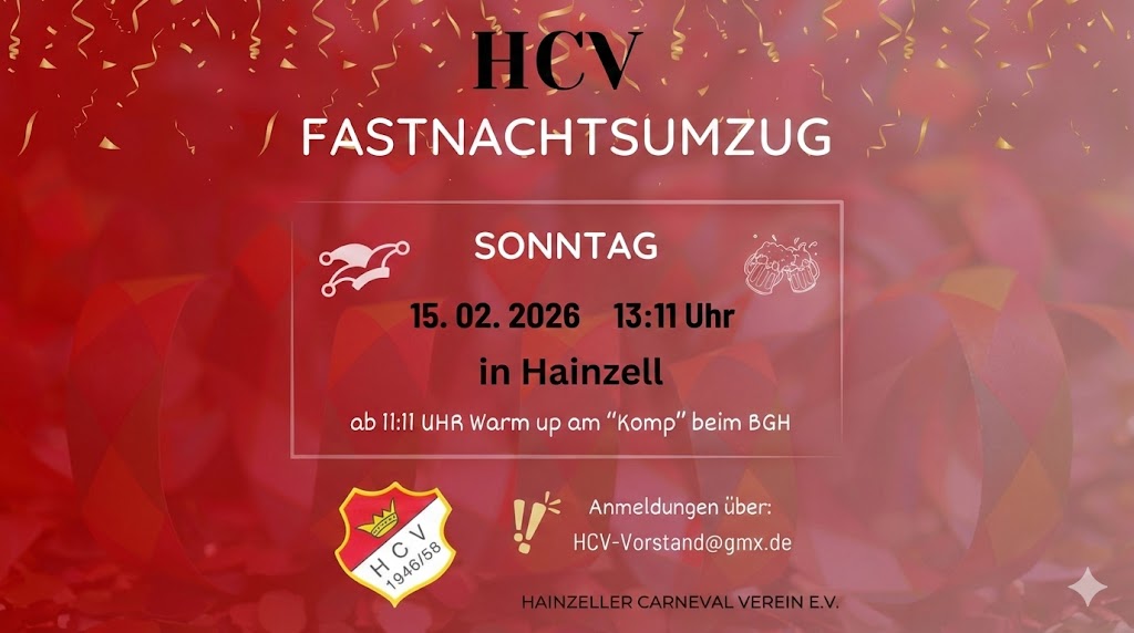 πŸŽ­πŸŽ‰ Fastnachtsumzug Hainzell 2026 πŸŽ‰πŸŽ­ Hainzell steht Kopf – der nΓ€rrische Lindwurm zieht wieder durch den Ort! πŸ₯³πŸŽΆ Am Sonntag, 15. Februar 2026 heißt es: KostΓΌme an, Konfetti raus und gemeinsam Fastnacht feiern, wie sie sein soll – laut, frΓΆhlich und kunterbunt 🎈🍻 Der Fastnachtsumzug startet um 13:11 Uhr und sorgt mit Musik, Gruppen, Wagen […]