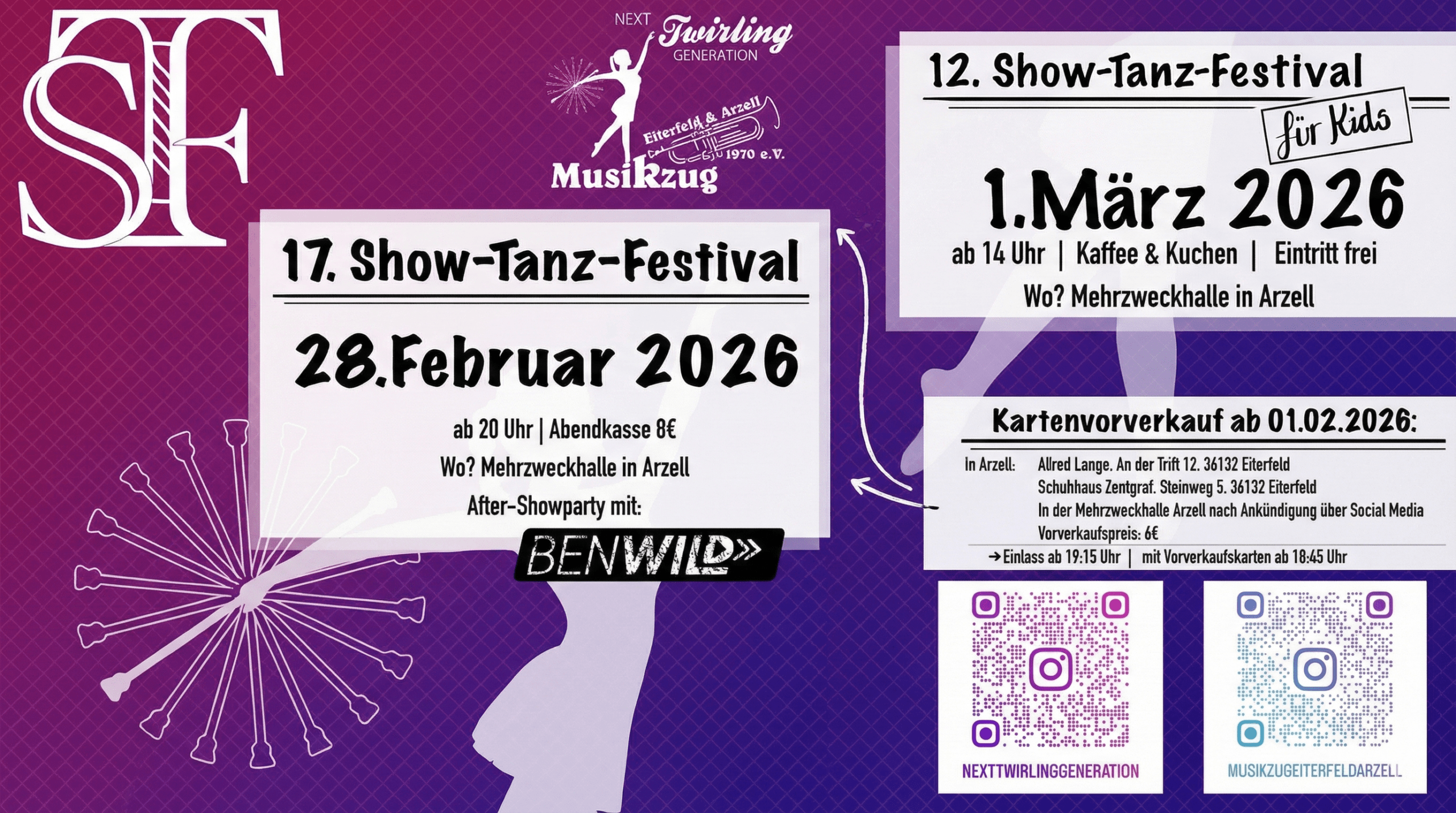 πŸ’œ 17. Show-Tanz-Festival Arzell 2026 πŸ’ƒβœ¨ Am 28. Februar 2026 ist es endlich wieder so weit: Das 17. Show-Tanz-Festival bringt die Mehrzweckhalle Arzell zum Beben! 🎢πŸ”₯ Freut euch auf einen Abend voller beeindruckender Choreografien, kreativer Shows und ganz viel Leidenschaft fΓΌr den Tanz. πŸ•— Beginn: 20:00 Uhr πŸ“ Ort: Mehrzweckhalle Arzell 🎟️ Eintritt: β€’ Vorverkauf: […]