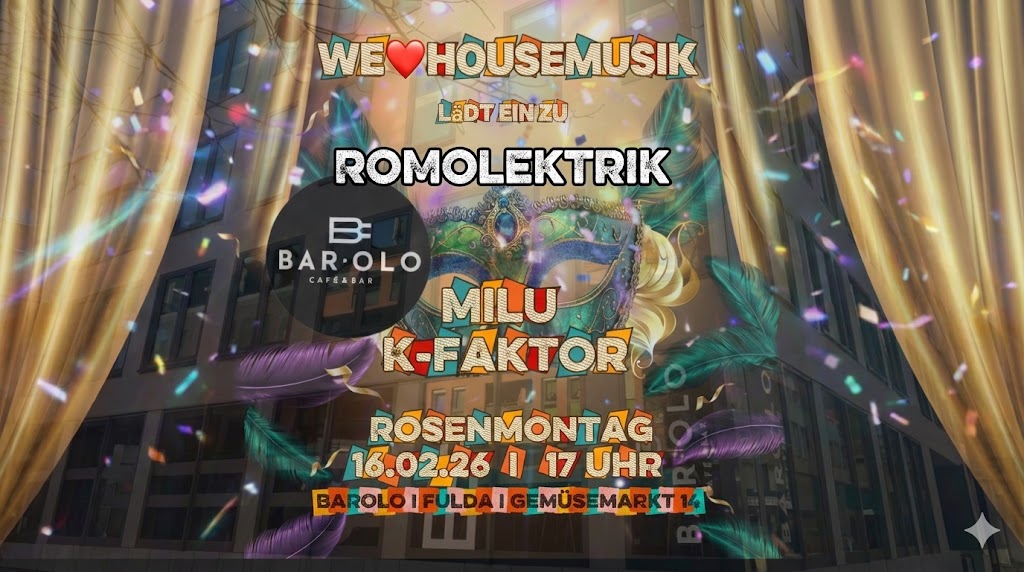 🎭✨ ROMOLEKTRIK im BAROLO Fulda ✨🎭 Das nΓ€rrische House Event an Rosenmontag We❀️HouseMusik lΓ€dt ein zu ROMOLEKTRIK, dem elektrisierenden Faschings Special fΓΌr alle, die Rosenmontag einmal anders feiern wollen 🎢⚑ Am Rosenmontag, 16.02.2026, verwandelt sich das BAROLO CafΓ© & Bar am GemΓΌsemarkt in Fulda ab 17:00 Uhr in einen pulsierenden Treffpunkt fΓΌr elektronische Beats, ausgelassene […]