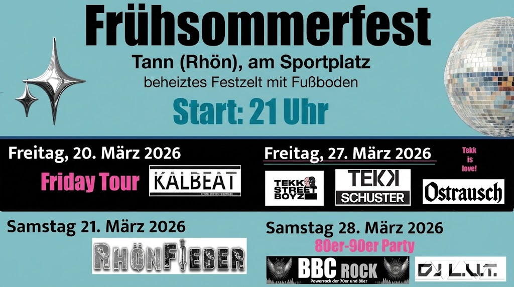 πŸŽ‰βœ¨ FrΓΌhsommerfest Tann (RhΓΆn) 2026 βœ¨πŸŽ‰ Vier Abende. Vier unterschiedliche Mottos. Ein großes Fest. πŸ₯³πŸ» Am Sportplatz in Tann (RhΓΆn) wird im MΓ€rz 2026 wieder ordentlich gefeiert. Alle Veranstaltungen finden im beheizten Festzelt mit Fußboden statt und starten jeweils um 21:00 Uhr. Perfekte Bedingungen fΓΌr lange NΓ€chte voller Musik, Tanz und guter Laune πŸ’ƒπŸ•ΊπŸ”₯ βΈ» […]