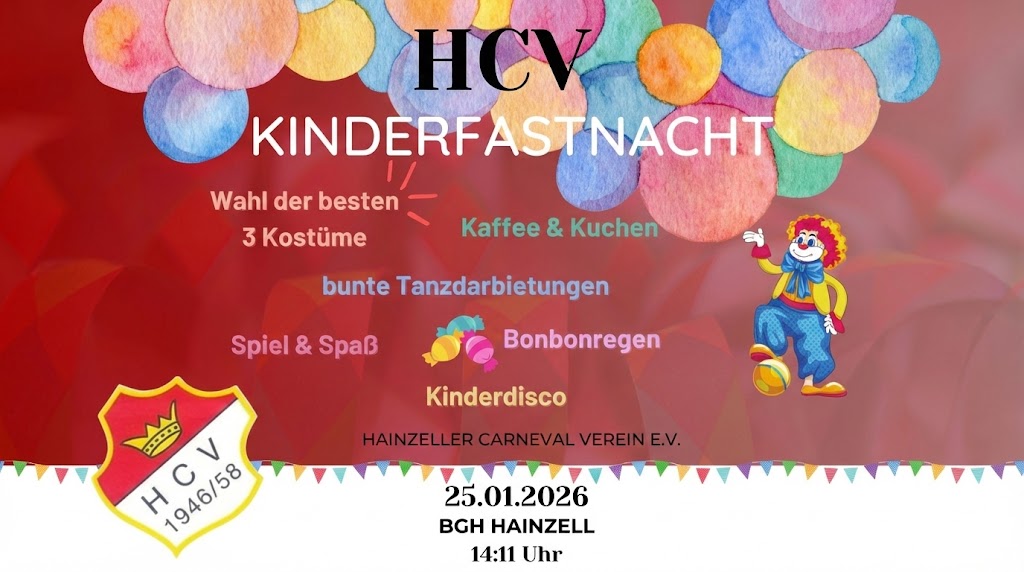 🎉🎭 Kinderfastnacht beim Hainzeller Carneval Verein e.V. 🎭🎉 Am Sonntag, den 25.01.2026, heißt es im Bürgerhaus Hainzell wieder 🎈 Bühne frei für die kleinsten Narren 🎈 Denn bei der Kinderfastnacht des HCV übernehmen die Kinder das Zepter der fünften Jahreszeit 👑🤡 Ab 14:11 Uhr erwartet die kleinen und großen Gäste ein fröhlicher, bunter Nachmittag voller […]