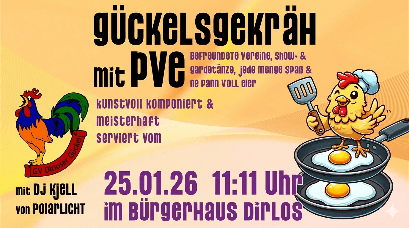 🐔💃 Gückel Dääänce Party in Dirlos 💃🐔 Am Samstag, 07. Februar 2026 wird das Bürgerhaus Dirlos zur Bühne für eine energiegeladene Showtanznacht voller Beats, Stimmung und guter Laune 🎉🔥 Freu dich auf eine mitreißende Showtanzveranstaltung mit den Spicy Chicks und dem GV Dirloser Gückel, die den Saal ordentlich zum Kochen bringen 🕺✨ 🎶 DJ Mah […]